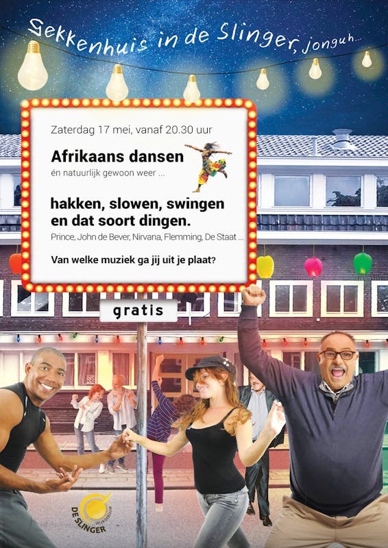 Wegens succes geprolongeerd: dansfeest in de Slinger. Na een goed bezochte avond in oktober vorig jaar doen we het zaterdag 17 mei weer: hakken, slowen, swingen en dat soort dingen. Dit keer hebben we Afrikaans dansen als thema. In het begin van de avond proberen we daarvoor ook iets van een workshop te organiseren. Na dat half uur gaat DJ Vic los. Niet alleen met Youssou 'N Dour of Hugh Masekela, want jij kunt natuurlijk jouw favorieten aanvragen. We maken er weer een toffe avond van waar niks moet en alles kan. Swingen met de buurvrouw van tegenover, bietje ouwehoeren met de buurman van hiernaast. Vind je dat ook gezellig, zin in? Komen dan! Welkom vanaf 20.30 uur.