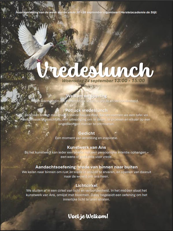 Bij Herstelacademie De Stijl willen wij de week van de vrede eren doormiddel van een vredeslunch! De kracht van samenkomen en stilstaan bij het thema vrede vinden wij belangrijk. Iedereen is welkom om hierbij aan te sluiten. Verspreid het rond. Aanmelden gaat via: