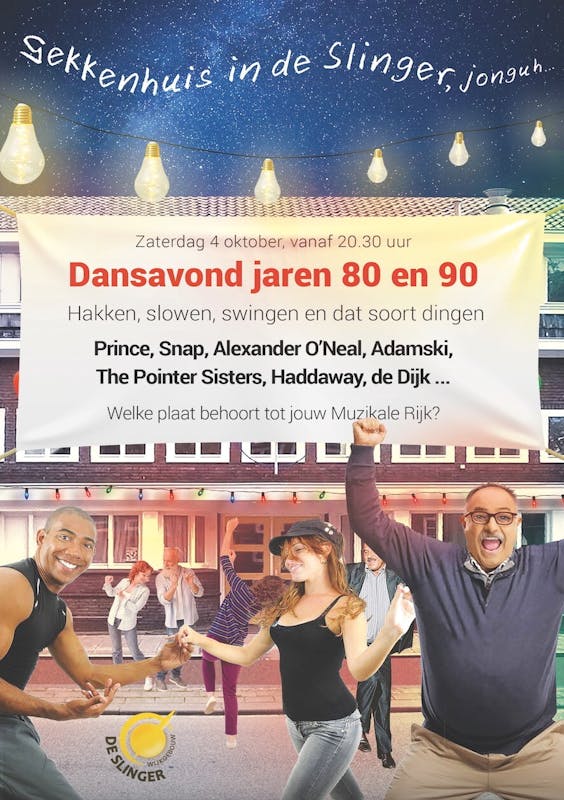Zaterdagavond 4 oktober is het weer zover, want dan vindt al weer de 3e editie plaats van het tweejaarlijkse dansfeest in de Slinger. Vanaf 20.30 uur start de dansavond die dit keer in het teken staat van de muziek uit de jaren 80 en 90. De grote zaal beneden en het cafégedeelte zijn dan omgebouwd tot een kleurrijke en gezellige disco-achtige ruimte. Leuk wanneer je komt en neem ook wat mensen uit je omgeving mee. Entree = gratis! Zegt het voort.