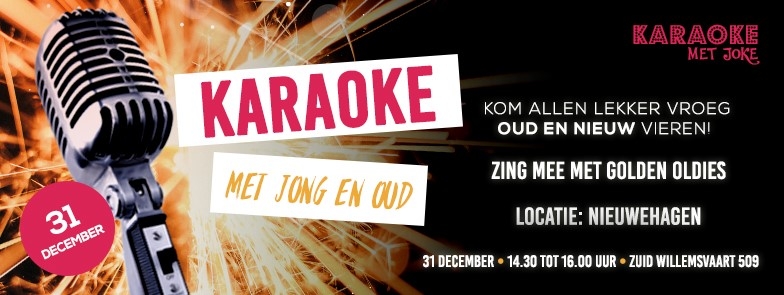 Karaoke met Joke gaat on tour! Oud, jong, fit, stijf, schnabbelaars, amateurs, kindsterretjes, koorleden en liefhebbers; iedereen is van harte welkom tijdens deze speciale middag-editie in verzorgingstehuis Nieuwehagen. Wij willen de bewoners van Nieuwehagen de oudjaarsdag van hun leven bezorgen en kunnen niet wachten om met jong en oud onze longen uit ons lijf te gaan zingen!