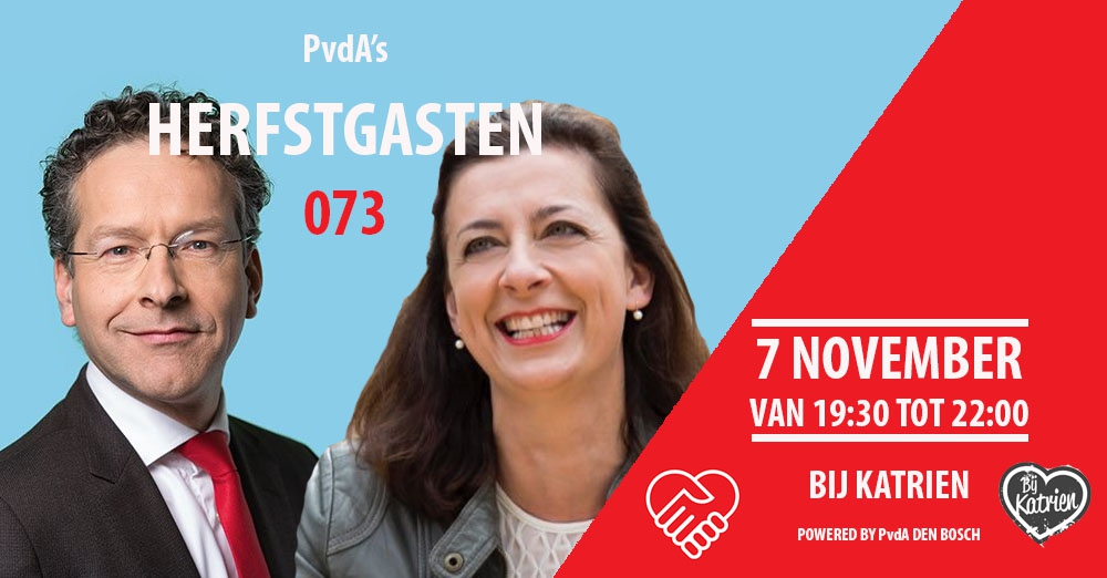 Na een succesvolle editie van WINTERGASTEN073 nodigt PvdA Den Bosch u van harte uit voor HERFSTGASTEN073 op woensdag 7 november in Bij Katrien. Jeroen Dijsselbloem, voormalig minister van Financiën en Viktorien van Hulst, directeur van Theaterfestival Boulevard schuiven dan aan tafel bij tafelheer Martijn van der Zande. Aan de hand van zelfgekozen televisiefragmenten vertellen zij over hun persoonlijke drijfveren. Over ambities voor stad, land én Europa. Entrée is gratis, aanvang is 19.30 uur.