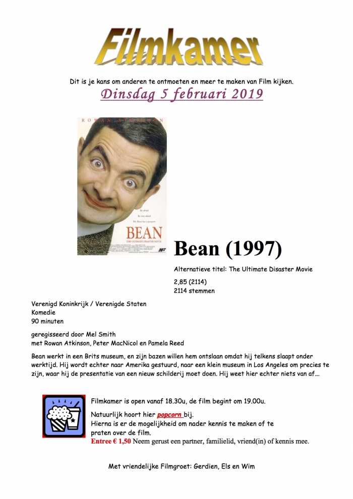 Dinsdagavond 5 februari (1e dinsdag van de maand) is er weer een Filmkamer. Dit keer met de film: BEAN. Zin om ook weer eens te lachen? Kom ook eens kennismaken. We zien je graag morgen.