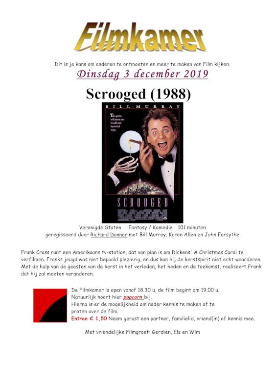 De filmkamer organiseert weer een filmavond. Dit keer met de film Scrooged.