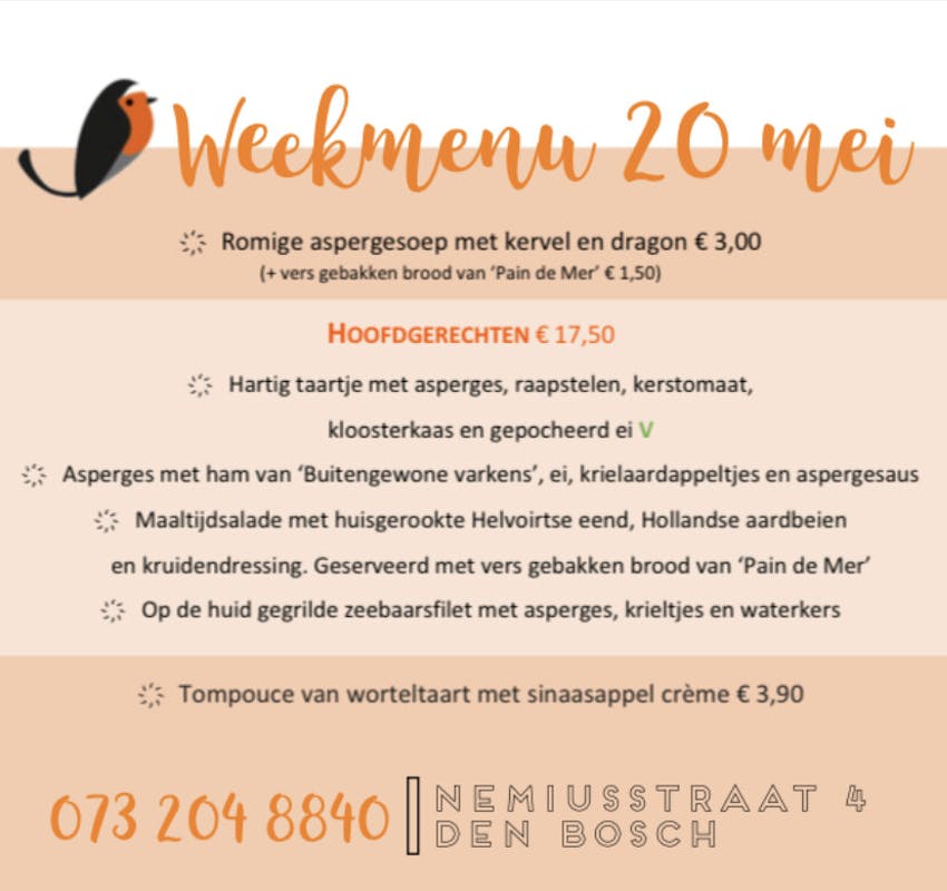 Als toevoeging op ons afhaalmenu, is er op woensdag een heerlijk buurtgerecht af te halen voor € 15,-. Dit gerecht wordt later bekend gemaakt.