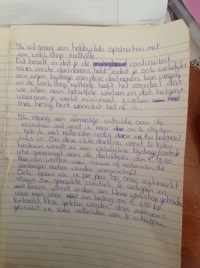 Er is een aanvraag binnengekomen voor een initiatief dat probeert de sociale verbondenheid in de wijk te bevorderen door middel van een creatieve hobbyclub. Deze is met name bedoeld voor buurt- en wijkbewoners die moeite hebben om te participeren in het wijkgebeuren en zodoende in een isolement driegen te geraken.