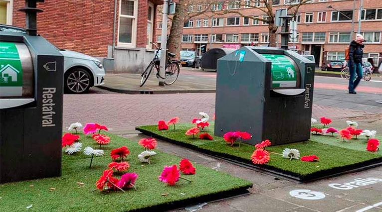 Groen en bloemen rond vuilcontainers zorgen ervoor dat mensen afval ín de vuilcontainer gooien, niet ernaast. blijkt uit een proef in Rotterdam. Een aanvraag van € 1321 voor 2x3 containers aan de Pelssingel, en 3 op de hoek Geert Van Woustraat/Geldersedam. Aanvrager bedoelt het als pilot; afdeling Openbare ruimte staat positief tegenover voorstel.