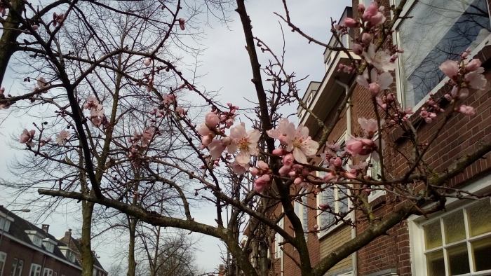 In de Noremborghstraat bloeit de amandelboom. Prachtig roze bloemen en volop knoppen. De amandelen zijn helaas niet te eten, te bitter en giftig. Het is nog altijd bijzonder in ons warmer wordend klimaat: zo'n boom komt echt uit warme landen ten zuiden van de Middellandse zee. In een bijbels visioen staat hij voor het snelle, vroege en alerte toeschieten van God bij de nood van zijn volk. De amandelboom staat bekend om zijn plotselinge loei, zijn snelle uitlopen in het voorjaar: een aankondiger van e lente. Zo ook in de Muntel. Ik wil er graag een foto bij doen, maar hoe moet dat?