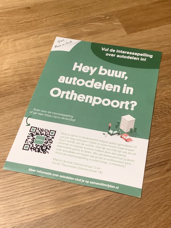 We zijn benieuwd wie er nog meer interesse heeft in autodelen in Orthenpoort. Daarom hebben Manon en ik (allebei uit de Silenenstraat) net een uitnodiging in alle brievenbussen in ons hele buurtje gegooid met een link naar een interessepeiling. Het zou superfijn zijn als er meer geïnteresseerden zijn. Dan kunnen we samen kijken wat we willen en wat daarbij past.