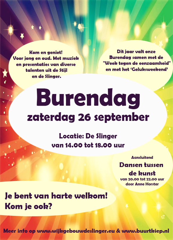 In het kader van de door Oranjefonds geïnitieerde landelijke Burendag is er op zaterdag 26 september een Burendag in De Slinger aan de Jan Schöfferlaan 3. Buurtbewoners zijn van harte welkom. Deelname is kosteloos.