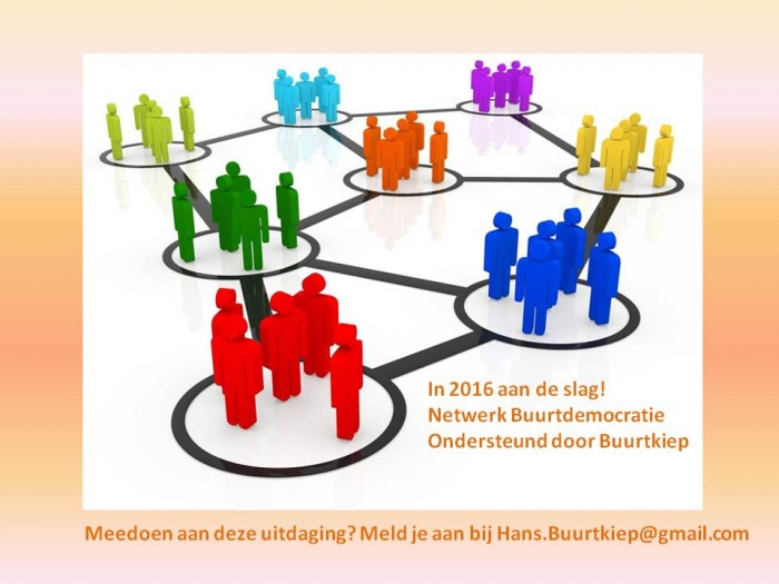 Via de Buurtkiep zijn er al veel buurtbewoners aan elkaar verbonden. Vandaar ook dat de Buurtkiep graag de aanzet geeft tot het vormen van een werkgroep. Deze werkgroep denkt en werkt een idee uit voor een overzichtelijke adviesstructuur voor onze wijk. De verwachting is dat deze klus in 2 à 3 bijeenkomsten geklaard is. Het streven is dit idee te presenteren in een grote wijkbijeenkomst in september.
