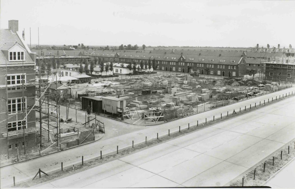 De Hosschiusstraat” heeft niet lang bestaan. Het terrein tussen de Pieter Borstraat en de Hosschiusstraat was oorspronkelijk als (speel)plein bedoelt. Maar na de tweede wereldoorlog was de woningnood zo hoog dat men besloot om daar noodwoningen te bouwen. Dit is goed te zien op de bijgaande foto uit 1949 met op de voorgrond de bouw van de Maria Goretti-school. Wat opvalt is dat tussen de Hosschiusstraat en van Voornestraat nog twee straatjes liggen.