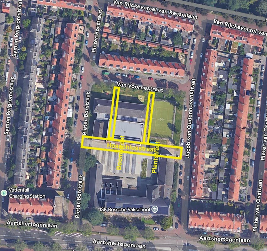 - Plantstraat (de verbinding tussen de van Voornestraat en de Hosschiusstraat aan de zijde van de Jacob van Oudenhovenstraat);