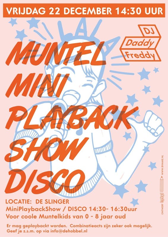 Vrijdag 22 december luiden we de kerstvakantie in met een onvervalste MUNTELMINIPLAYBACKSHOW KERSTEDITIE! Kom dansen als een elfje, een zuurstok of een kerstbal of playback je lievelingsliedje verkleed als kerstboom. We starten om 14:30 in Wijkgebouw De Slinger. Tot in de kerststal girls & boys!