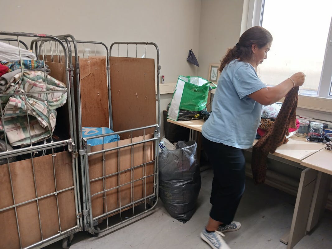 Foto 2: Hier zoekt Madiha tussen de kleding naar wat bruikbaar is en naar de winkel mag.