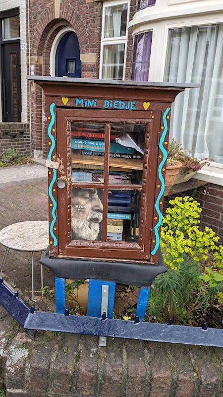 Een prachtig versierd boekenkastje is te vinden aan het begin van de Noremborgstraat!