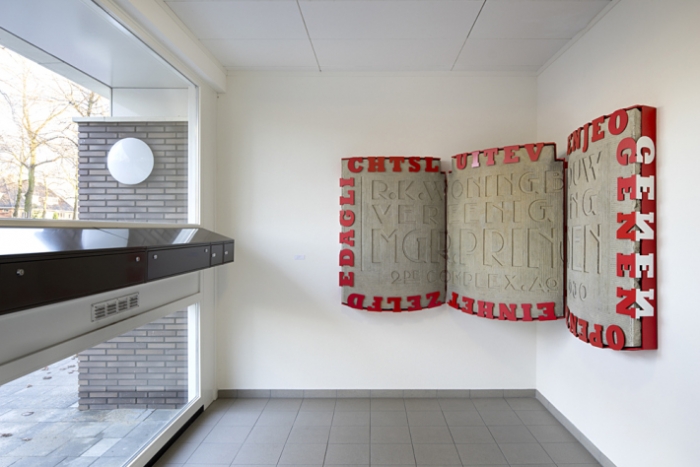 Door de woorden “Sluit even je ogen en open ze in hetzelfde daglicht” als een tweede tekstlaag rondom de historische stenen aan te brengen ontstond een nieuw werk. De werk is nu binnen in de entree aan de Willem van Nassaulaan te bewonderen. Om het te kunnen zien moeten we dus even door het raam naar binnen kijken.
