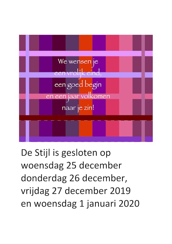 Wil je graag met De Stijl in contact blijven? Dat kan! Telefonisch contact Maandag, dinsdag, donderdag van 09:30u tot 16:30u, woensdag en vrijdag van 09:30u tot 13:00u kun je ...