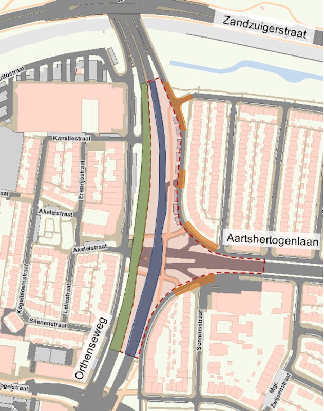 In deze fase gaan we aan de slag met een deel van de Orthenseweg en de Aartshertogenlaan. Het werkgebied is met een rode stippellijn in de afbeelding aangegeven. Op de parallelwegen gaan we op vier locaties aan het werk. Deze locaties zijn oranje in de afbeelding.