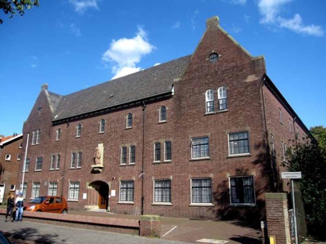 De hoofdingang van het Steunpunt Zelfhulp \'s-Hertogenbosch & Regio in het voormalig Fratershuis van de Fraters van Tilburg. Nadat pastoor B. Schoenmakers in 1933 in De Vliert een nieuwe parochie had gesticht en er twee scholen waren geopend, wilde hij er ook een fraterhuis vestigen. Een aantal FRATERS VAN TILBURG van de Papenhulst kwam vanaf dat jaar in een blok van drie huurhuizen in de Antoon der Kinderenlaan wonen. Er werd een terrein van de gemeente aangekocht naast de kerk, grenzend aan de Pius X-school. Architect C. Panis uit Tilburg bouwde een fraterhuis, dat 5 november 1939 werd ingezegend en betrokken. De fraters verlieten dit huis in 2004, maar zijn nog steeds eigenaar. Het is sinds 2005 in gebruik bij het Steunpunt Zelfhulp \'s-Hertogenbosch & Regio, Stichting Exodus en Humanitas. Het rijzige gebouw vertoont met zijn sobere gevels en de topgevels met schouders en topmakelaars kenmerken van de Delftse School. De ramen hebben een ijzeren kleine roedenverdeling met glas in lood en boogstenen van natuursteen. Op de eerste etage zijn ze deels gekoppeld, op de bovenste verdieping zijn rondboogvensters toegepast. De portiek heeft een getrapte omlijsting, met boven de ingang een beeld van de H. Leonardus van Veghel. De gevels zijn opgetrokken in een groot formaat baksteen met vlechtingen en tandlijsten onder de goot. Op het zadeldak liggen verbeterde Hollandse pannen. De carré wordt aan de achterzijde gesloten door de kapel. Deze heeft een zadeldak en een met koperen platen beklede torenspits, die eindigt in een stervormig piron. Inwendig heeft het klooster lambriseringen van geglazuurde baksteen. In de kapel schoon metselwerk met geglazuurde baksteen. Glas-in-loodramen met religieuze symbolen, altaarkruis, kruiswegstaties en reliëfs in geglazuurde terracotta. Er zijn in de eenlaagse aanbouw terracotta tegels toegepast. De baksteenommuring bestaat uit een muurtje met een ronde ijzeren buis en heeft een ezelsrug. Op een sokkel staat een heiligenbeeld. De kloostertuin bevat vele hoge bomen, waaronder kastanjebomen.