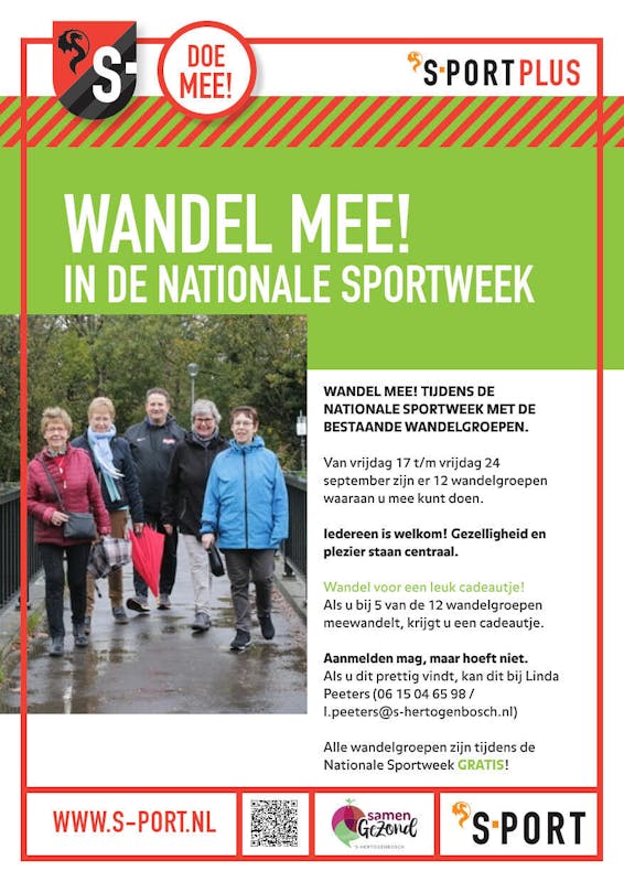 Bekijk de flyer voor de overige wandelingen. Het gaat in een rustig tempo en iedereen is welkom. Meer info via .s-port.nl/nationale-sportweek-wandel-mee