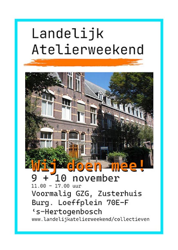 Wees welkom tijdens het Landelijk Atelierweekend op 9 en 10 november van 11.00 tot 17.00 uur in het voormalig GZG, Zusterhuis. Burgm. Loeffplein 70E-F, 's-Hertogenbosch.