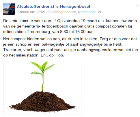 Wie wil er voor de buurttuin ~gratis~ compost gaan halen bij de Afvalstoffendienst? We kunnen wel veul en nog n bietje gebruiken.... Alle bietjes helpen!
