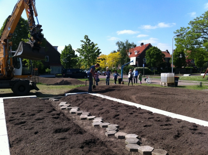 Afgelopen week is er heel hard gewerkt om de hele grote moestuinbakken te maken. Vandaag is er heel hard gewerkt om de heuvels te maken. Samen met buurtbewoners uit de Frederik Hendriklaan en Baden Powellstraat is er gezorgd dat er ook water is. En op de achtergrond is er nog heel veel meer gebeurd door veel buurtbewoners.